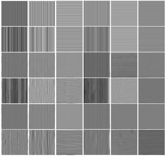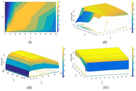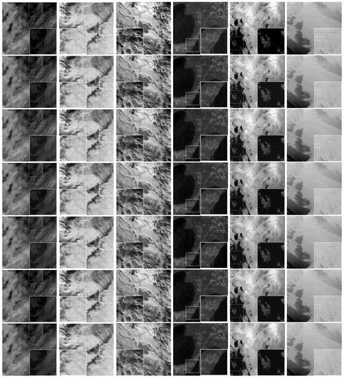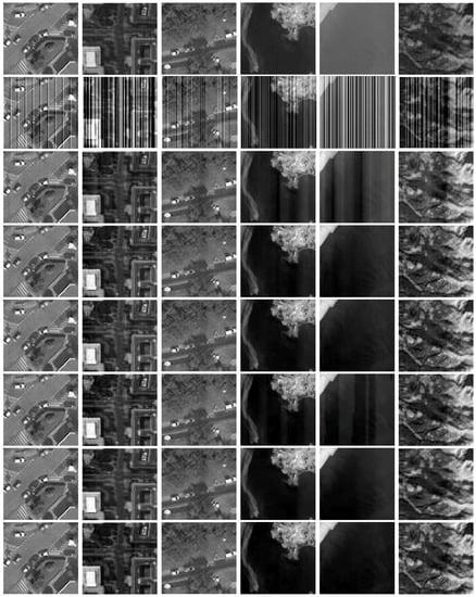 From the results in Figure 13, we can conclude three points. (1) The PSNR results of the proposed model (i.e., ) have the best performance compared to those of the other two models (i.e., and ), and the SSIM results have the similar performance as compared with the PSNR results. (2) shows more stability than as the green bars do not significantly change with different stripes. (3) actually plays a more important role than with respect to PSNR (see Figure 13I,III. On the contrary, plays a more important role than with respect to SSIM (see Figure 13II,IV). Figure 13 demonstrates the effectiveness of the proposed model and the importance of the three terms.
