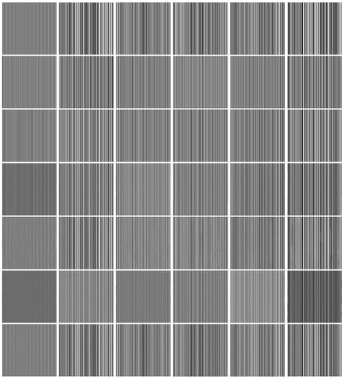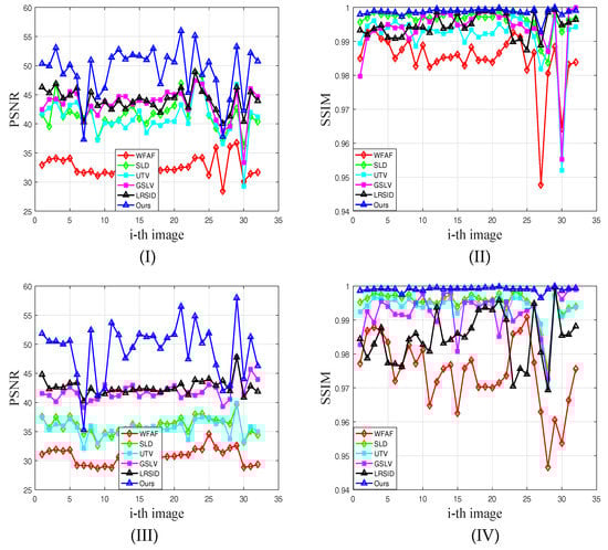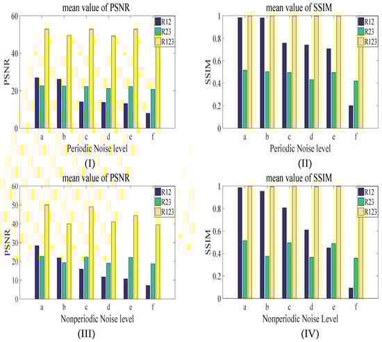 Figure 13I,II show the mean value of PSNR and the mean value of SSIM on 32 images same as before for periodic stripes. The periodic stripe levels in Figure 13a–f are (Per, 10, 0.2), (Per, 10, 0.6), (Per, 50, 0.2), (Per, 50, 0.6), (Per, 100, 0.2) and (Per, 100, 0.6), respectively. Moreover, Figure 13III,IV display the mean value of PSNR and the mean value of SSIM on 32 images for nonperiodic stripes. The nonperiodic stripe levels in Figure 13a–f stand for (NonPer, 10, 0.2), (NonPer, 10, 0.6), (NonPer, 50, 0.2), (NonPer, 50, 0.6), (NonPer, 100, 0.2) and (NonPer, 100, 0.6), respectively.