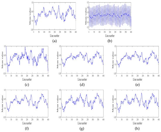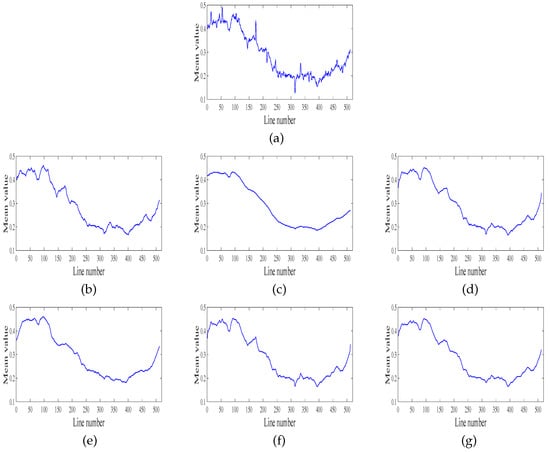 In real experiments, we also show the mean cross-track profile and the power spectrum in Figure 10 and Figure 12, respectively. Figure 10 shows the mean cross-track profile results of the first column of Figure 7. Note that Figure 10a is the mean cross-track profile result of the first real remote sensing image, and Figure 10b–g shows the profile results of the six destriping methods, respectively. In general, the profiles of the destriping method should smoothen huge fluctuates and maintain primary structure information. However, the profiles of WFAF and LRSID have obvious fluctuations where the stripes still exist, and that of SLD is over-smooth which loses a lot of underlying image details. In Figure 10d,e, although stripes are mostly removed, the destriping profiles have some mild blur and too much smoothness because of the unidirectional property of UTV and the global sparsity of GSLV, respectively. In addition, the profile of the proposed method, i.e., Figure 10g, can realize the desired result both on removing stripes and keeping underlying image details.