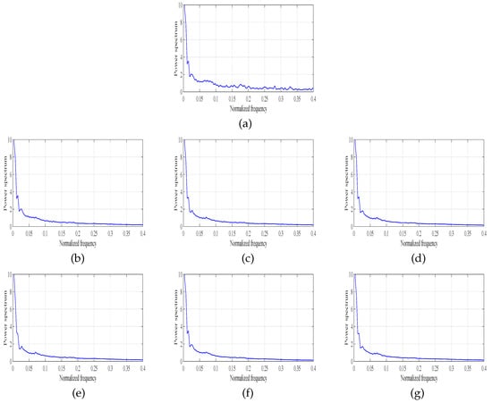 In Figure 12, the power spectrum results of the fourth example of Figure 7 are plotted. Figure 12a–h represent the power spectrum results of the fourth real remote sensing image and six destriping methods, respectively. We observe that the real remote sensing image in Figure 12a has many fluctuations where stand for stripes. According to the power spectrum results of the six methods in Figure 12b–f, although the stripes are almost removed well, there are still some slight blurring regions, while the proposed method shows the desired performance in Figure 12b.