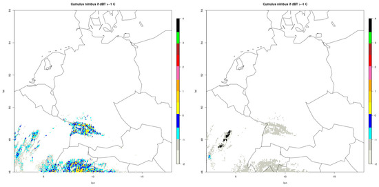 In the experiments with the NWP filters a Cb can only occur if the stability filters exceed the filter thresholds independent of the satellite signal. For the combination of CAPE and TOTALX it is an or operator conjunction, thus a Cb is assigned if one of the two filter thresholds is exceeded. For experiments without NWP filter Cb occurs if the BT difference is higher than the BT threshold defined for the respective experiment. With respect to the satellite part, various channels and BT thresholds are applied in the experiments. The respective settings are described in more detail in Table 1. Figure 3 illustrates the effect of the NWP filter on the satellite based Cb detection.
