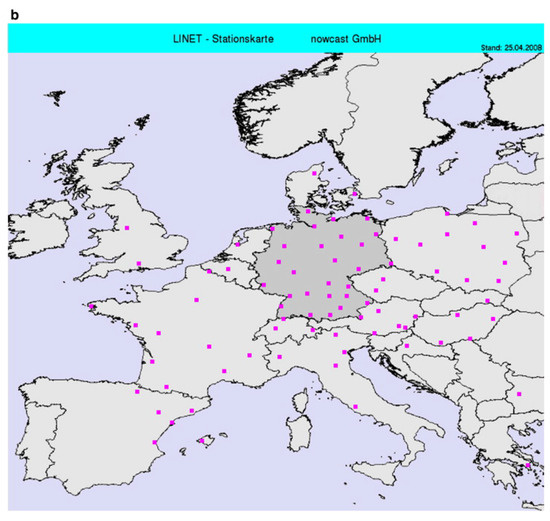 Lightning data from a low frequency (VLF/LF) lightning detection network (LINET), discussed in [15,16], are used for validation. The measurement network provides cloud-to-ground lightning strokes (CG) and inter-cloud lightning (IC). According to [15], the position accuracy reaches an average value of about 150 m, whereby false locations (‘outliers’) rarely occur. The study focuses on Central Europe where the LINET network density is highest, see Figure 4. The borders of the validation region are as follows: Latitude 45.5–56.5N and Longitude 2.0–18.0E. The skill scores Probability Of Detection (POD), False Alarm Rate (FAR), Critical Success Index (CSI) and the accuracy (ACC) are used to measure the performance of the different experiments. For completeness the quantities are defined below: