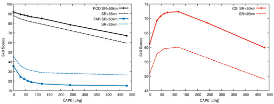 Figure 5. Skill scores (POD, FAR, CSI) in % plotted against CAPE for the 2016 period and a SR of 50 and 35 km, respectively. (Left) POD and FAR decrease with increasing CAPE. However, the decrease in POD is almost linear, whereas, FAR shows a strong decrease for low CAPE values up to a value of about 80. Then, FAR decreases only slightly with a tendency of getting constant for large CAPE values. (Right) This leads to the typical form of CSI. Strong increase for low CAPE values up to a maximum and an almost linear and moderate decrease afterwards.