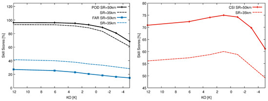 Figure 6. Skill scores (POD, FAR, CSI) plotted against KO for the 2017 period and a SR of 50 and 35 km, respectively. (Left) POD and FAR decrease with increasing CAPE. The form of FAR and POD is different compared to CAPE, resulting from the different definition of these variables. (Right) Again the relation between POD and FAR leads to a typical form of CSI. Strong increase for low (negative) KO values up to a maximum and an moderate decrease afterwards. Please note, the results for KO = −3 were not available for the SR35 plot.