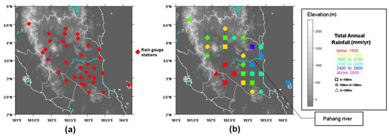 Study location in Pahang river basin. (a) Rain gauge station location and (b) Total annual rainfall is calculated between years 1998 to 2016. Each point represents a rain gauge location(s) co-located to the midpoint of TRMM pixels (see further explanation of the pixel-point construction in Section 2.1). Two points are located outside Pahang state but are located within the Pahang River basin tributary area.