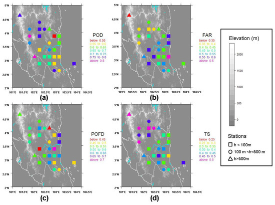 The probability of detection (POD) values for rainfall estimates in Pahang are shown in Figure 2a. The figure shows that 14 out of 27 pixel-point pairs located in the low and mid-altitude region have POD scores lower than 0.7. The lowest POD value is 0.54, which is located near to the coast. Table 5 shows that the POD values vary from 0.5 to 0.8 (with average POD of 0.68), which can be considered as an acceptable performance. A previous study analysing the performance of TRMM, amongst other satellite products over a smaller time window (2003–2007), shows that the POD for the rain gauges in Pahang have a range of 0.7–0.8, which is close to the range of scores obtained (0.5–0.8) [36]. The region-specific performance could be due to the fact that the spatial resolution (0.25°) causes TRMM estimates to be insensitive to local-scale precipitation events.