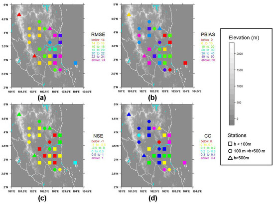Figure 3a shows the RMSE between the gauge and TRMM daily rainfall over the Pahang Basin. The lowest RMSE is found in one of the high-altitude stations (RMSE = 12.80 mm/day) at Gunung Brinchang Station. However, the value is still considered as a large error, considering the average daily rainfall at the station is 19.14 mm/day. On the other hand, the higher RMSE is located near to the coastal region (RMSE = 29.87 mm/day). This result agrees with a study in Iran, which shows that estimations of satellite rainfall in highland and mountainous areas are more accurate than in lowland areas [39]. Besides that, TRMM performs poorly on coastal and island sites, which is consistent with the study carried out in Tropical Pacific Basin [40]. The convergence zones can be persistent when the breezes and synoptic gradient winds interact with each other and the surface friction increases in transition from sea to land [41]. When the level of convergence of moist air is low, it will assist the dynamical and microphysical processes for the formation of clouds and precipitation [41]. Due to this, the TRMM estimates can be inaccurately measured.