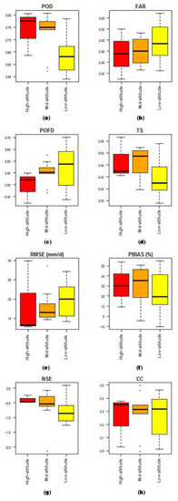In Figure 4a, approximately 50% of the points in the high-altitude have POD scores higher than 0.77, but the results constitute a higher frequency of lower valued scores. While at the mid-altitude, about 75% of the pixel-point pairs have POD scores of more than 0.74. However, there are exactly two pixel-point pairs that have POD scores below 0.60. In the low-altitude regions, the distribution is positively skewed and all the station scores are under 0.80. There are about 50% pixel-point pairs with POD scores lower than 0.63.