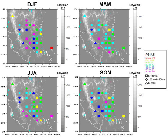 A seasonal analysis is performed by taking all seasons from 1998 to 2014 into consideration. Figure 5 shows the PBIAS of TRMM in each season. During the wetter seasons (DJF and MAM), negative bias occurs in the coastal region and in Cameron Highland (highest altitude pixel-point pair). The rest of the locations show high numbers of overestimated PBIAS readings. This is contrary to other reports of underestimations during the wet season, for example, by Zulkafli in Andean–Amazon River [45]. Inland locations generally show overestimations. DJF and MAM seasons are overestimated on average by 33.05% and 30.33%, respectively. In dry seasons, there are several locations that show an underestimation by TRMM, mostly located in the area close to the coastal region. However, on average, the average PBIAS reading for JJA and SON is 29.81% and 22.92%, respectively, demonstrating overestimation. The overestimation in the wet season and dry season in the inland locations may be attributed to the type of rainfall events that predominantly occur, which are longer term low to moderate intensity rainfall. TRMM can overestimate rain for light and moderate rain rates and underestimate for heavy rain rates, as reported by Guo [17].