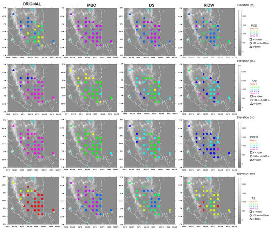 On the other hand, the average pre-corrected TS shows a slightly weak performance, but after being bias adjusted, the scores improved. The MBC method improved the scores especially for pixel-point pairs at the coastal region and some pixel-point pairs in the inland region. The DS method particularly improved some pixel-point pairs in the inland region and there is not much improvement in the TS scores for the RIDW method as the average pre-corrected TS score (TSav = 0.423) is close to the average post-corrected TS score (TSav = 0.552).