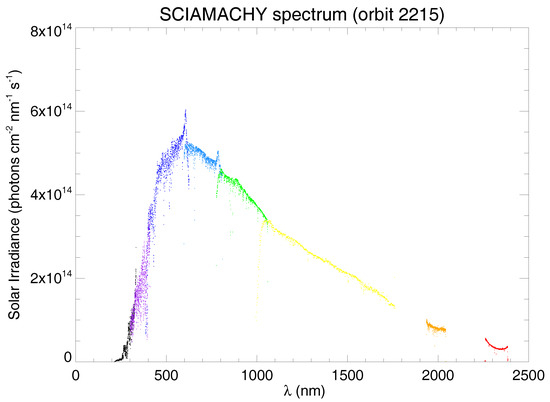 Solar spectrum measured by SCIAMACHY on 2 August 2002. The different colors represent its different channels from 1 to 8.
