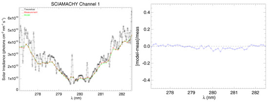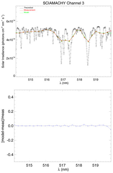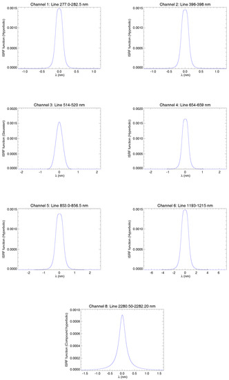 where is the solar spectrum. After the convolution, the resulting spectra are pixel sampled to match SCIAMACHY wavelength axis in order to fit the modeled against a SCIAMACHY solar measurement , while the ISRF is the free component to be estimated. We retained the ISRF function that provided the best fit of the solar measurements (Equation (1)) in each channel.