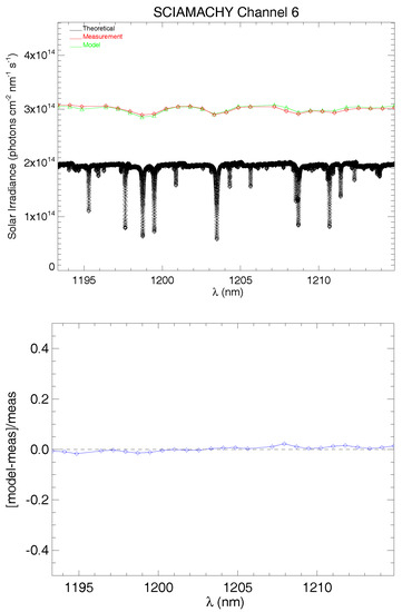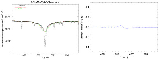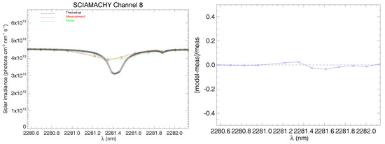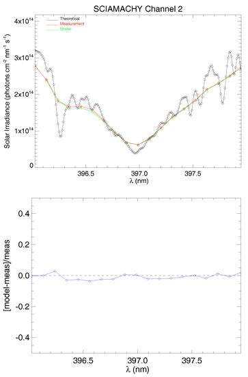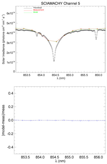 Figure 3, Figure 4, Figure 5, Figure 6, Figure 7, Figure 8 and Figure 9 show examples of the corresponding SCIAMACHY measurements in orbit 8884 including their modeled counterparts, as well as their relative fitting residuals. The theoretical highly resolved corresponding solar lines are shown to verify the consistency between the measured and the theoretical spectra. The corresponding deduced ISRFs are shown in Figure 10.