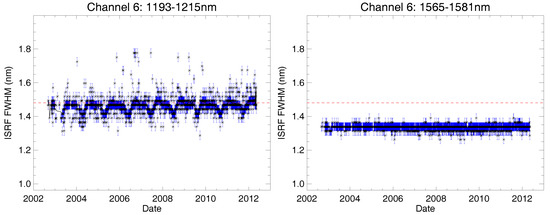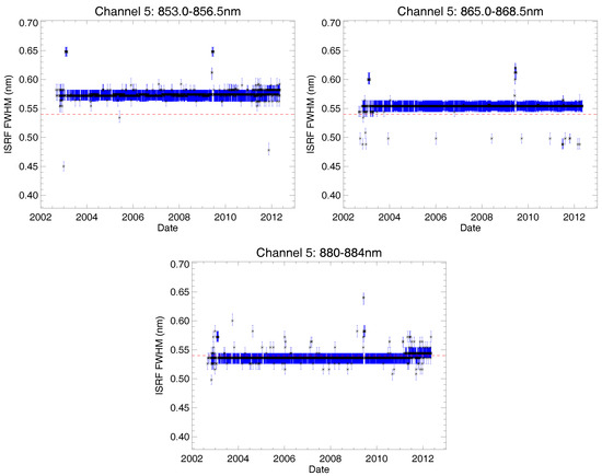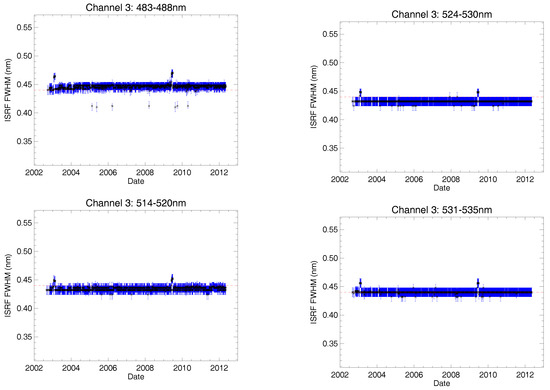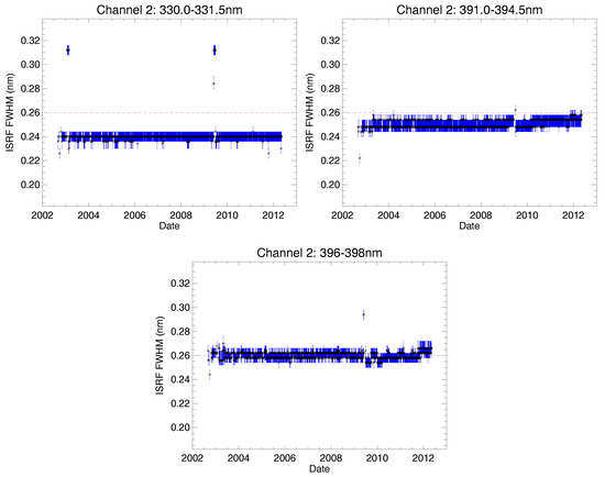 The corresponding Figure 11, Figure 12, Figure 13, Figure 14 and Figure 15 show stable FWHMs in time, within the error bars, except in channel 1. In this channel, the FWHM increases not linearly beyond the error bars with the time. Its value increases from ≃0.23 nm to reach ≃0.256 nm in 2008, where it stays until mid 2009, and then drops down to ≃0.252 nm and stays there until the end of the mission in 2012. Furthermore, its average value over the life time of the mission is 0.258 ± 0.005 nm. The other UV/VIS channels (channels 2–5) do however not show such a variation or trend. They are pretty stable over time within the error bars. Furthermore, the observed sharp decrease of the optical throughput in channels 1 & 2 [7] does not provide an obvious explanation as to why the FWHM varies over time in channel 1, since we did not see a similar trend in channel 2. This perhaps would still need a further investigation.