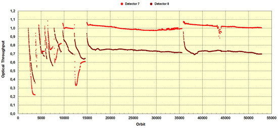 Degradation of SCIAMACHY throughput relative to August 2002 in Channel 7 & 8 in the calibration light path as a function of orbit [15].