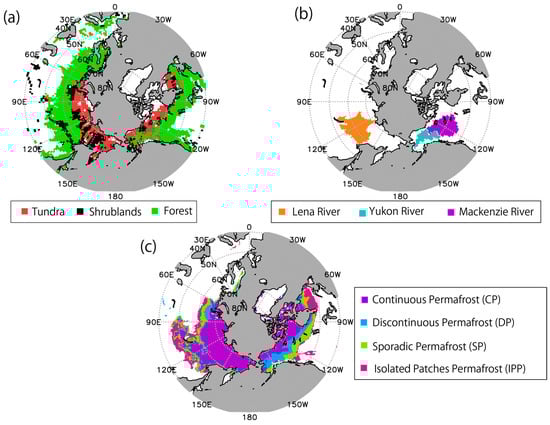 Maps of the study sites. (a) Vegetation map (red color denotes ACTR), (b) the largest pan-Arctic river basins, and (c) the permafrost distribution.