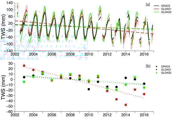 The mean annual TWS is plotted in Figure 2b for all years except 2002 when insufficient data were available (less than nine months). In these smoothed datasets, TWSGRACE was more strongly correlated with TWSGLDAS2 (τ = 0.52, p = 0.0098) than with TWSGLDAS1 (τ = 0.45, p = 0.0264). TWSGRACE, TWSGLDAS1, and TWSGLDAS2 decreased by −1.2 mm y−1 (τ = −0.45, p = 0.0375), −4.5 mm y−1 (τ = −0.71, p = 0.0005), and −1.3 mm y−1 (τ = −0.34, p = 0.1005), respectively. Thus, the long-term trends observed in the mean annual TWSGRACE were consistent with those observed in TWSGLDAS2. Overall, these TSW data showed a decrease throughout the ACTR between 2002 and 2016, thereby providing evidence that hydrological changes are not only limited in the downstream of the Lena River basin, as reported in [12] but also are expanding throughout the whole ACTR.