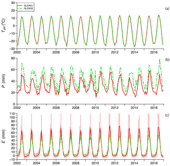 The GLDAS1- and GLDAS2-based E increased steadily from 2002 to 2016 with slopes of approximately 4.1 mm y−1 for EGLDAS1 (τ = 0.66, p = 0.0008) and 1.2 mm y−1 for EGLDAS2 (τ = 0.49, p = 0.0133). The increase in E from either GLDAS dataset can explain most of the decrease in TWSGRACE shown in Figure 2b.
