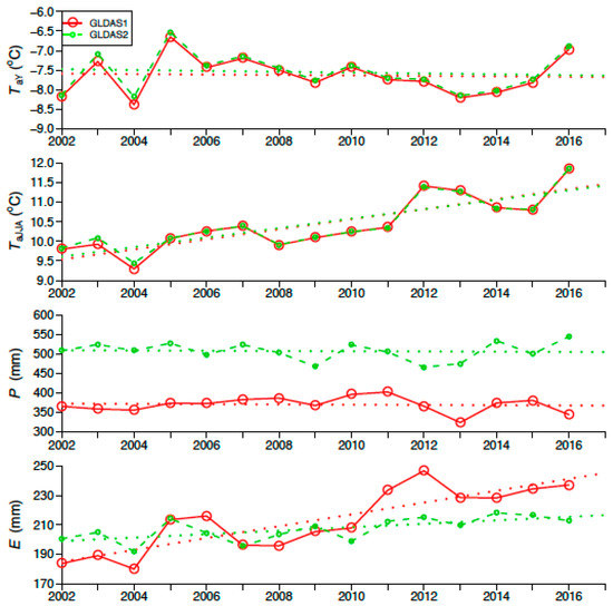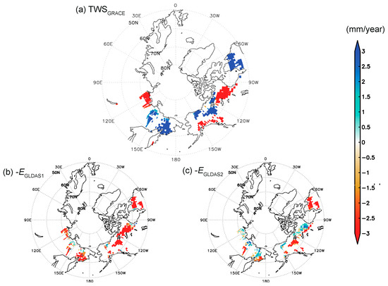 However, there are also significant differences between the GLDAS products. For example, the values of P in GLDAS2 exceed those in GLDAS1, although the air temperatures are consistent between the two products. Combined with the stronger spatial correlation coefficients between TWSGRACE and PGLDAS2 (Table 2), we suggest that the GLDAS2 products are more suited for pan-Arctic hydrological analyses than GLDAS1. In addition, EGLDAS2 demonstrated a higher correlation with the spatial trends in the GRACE-based TWS. However, the linear trend in EGLDAS1 was much larger than that in EGLDAS2 with nearly ubiquitous negative trends over the ACTR. These results correspond with the results of Wang et al. [25], who showed that EGLDAS1 overestimated the evapotranspiration relative to EGLDAS2.