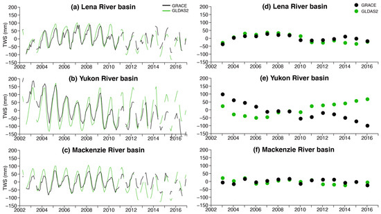 Temporal variations in TWS among the largest pan-Arctic river basins from 2002 to 2016. (a–c) Monthly and (d–f) annual mean values. (a,d) Lena River basin. (b,e) Yukon River basin. (c,f) Mackenzie River basin.
