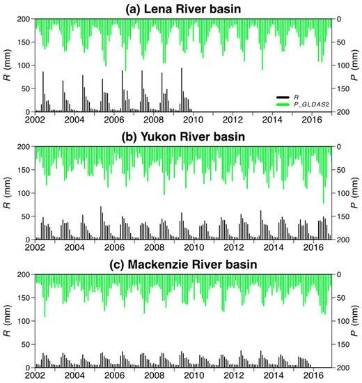 Figure 7 shows the temporal variations in the monthly basin-averaged precipitation (PGLDAS2) and river runoff rates of each river basin. The maximum monthly P occurred in July for the Lena and Mackenzie River basins (Figure 7a,c) and in June or July for the Yukon River basin (Figure 7b). The Lena River exhibits the largest amount of river runoff (R), followed by the Yukon River and the Mackenzie River. The peak value of R occurred in June for all three rivers. Using monthly climatology of river runoff data, the peak snowmelt occurs between April and June, accounting for approximately 40%, 36%, and 28% of the annual R in the Lena River, Yukon River, and Mackenzie River basins, respectively.