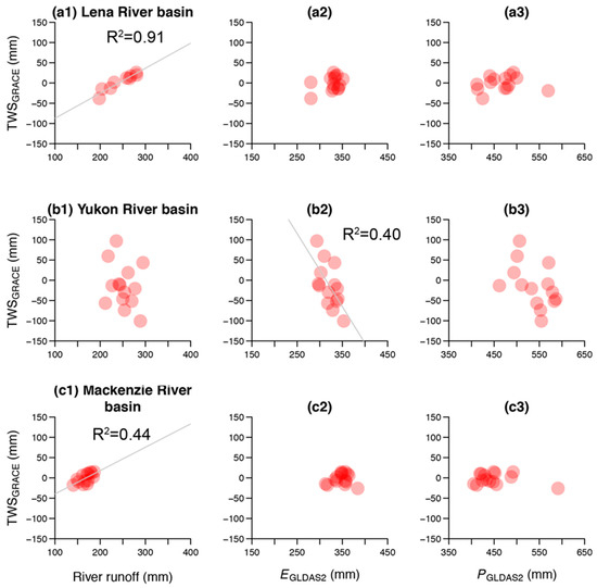 Relationships among the annual basin-scale TWS and the water balance components in the (a) Lena River basin, (b) Yukon River basin, and (c) Mackenzie River basin. Also shown are the (1) river runoff, (2) EGLDAS2, and (3) PGLDAS2. The gray lines denote linear regression lines when p < 0.05.