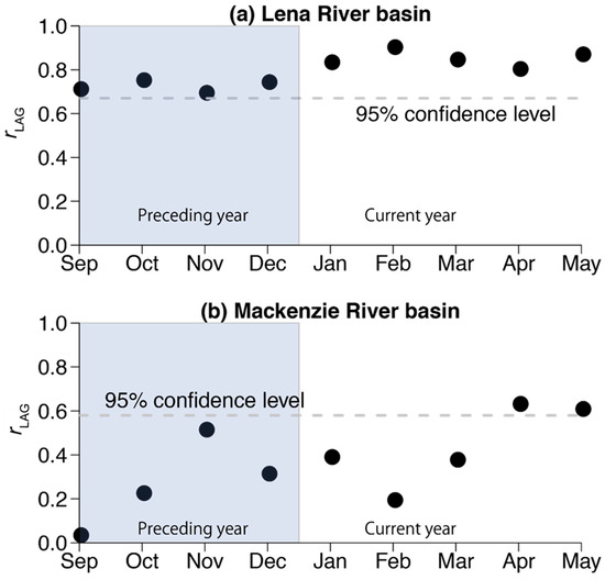 Statistically significant increases in rLAG are observed in September in the Lena River basin and in April in the Mackenzie River Basin (Figure 9). The maximum rLAG corresponds to TWS in February for the Lena River Basin and in April for the Mackenzie River, suggesting that the conditions in previous autumn and winter affected only the river runoff in continuous permafrost basins, such as those in the Lena River. Only a small portion of the Mackenzie River basin is covered by continuous permafrost; nearly half of the basin is free of permafrost. Therefore, the high rLAG value in autumn within the Lena River basin indicates that the autumn TWS can serve as a climatic signature for permafrost-dominated river runoff in any given year, as was noted by Suzuki et al. [12]. The influence on the autumn TWS from the preceding year is evident, despite the inclusion of the snow water equivalent over the land. However, in basins such as the Mackenzie River, which are not dominated by permafrost, the TWS from the preceding year had no effect on the river runoff of the following year.