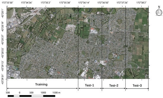The aerial image dataset and the corresponding building outlines (stored as polygon shapefiles) were downloaded from the website of Land Information of New Zealand (https://data.linz.govt.nz/layer/53413-nz-building-outlines-pilot/). The aerial images were captured during the flying seasons of 2015 and 2016. The provider converted the original images into orthophotos with a spatial resolution of 0.075 m and divided them into tiles. The tiles within the study areas were merged into a single mosaic for the experiment. Meanwhile, some of the building outlines were extracted by aligning with their ground positions rather than their roofs. Considering that our target was to precisely detect the buildings’ roofs, before the experiment, the whole dataset was carefully scanned and each polygon manually adjusted to align strictly with the corresponding roofs. As shown in Figure 1, the study area was divided into training and testing areas of equal size including 8258 and 9134 building objects, respectively. The training area consists of almost evenly distributed non-housing background and residential areas. To evaluate the model’s ability of building detection under variant land-cover conditions, the test area was further divided into three subregions: Test-1, Test-2 and Test-3. The Test-1 region occupies large residential areas, but also includes quite a lot of farmland and lakes. The Test-2 area is dominated by residential areas and some traffic roads. In contrast, the Test-3 region has only a small portion of residential areas but a large area of background vegetation.