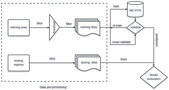 Figure 2 shows the scheme of the study. The aerial imagery of the study area undergoes a framework of data preprocessing to generate training and testing data (see Section 2.2.1). Then, our proposed MC–FCN model is trained using 70% of the training data. The remaining 30% of the training data is used for cross-validation. The trained model with proper hyperparameters will be chosen to make predictions on the testing data and evaluated by five commonly used evaluation metrics including precision, recall, Jaccard index or intersection over union (IoU) [32], overall accuracy [33] and kappa coefficient [34]. Smoothing the final segmentation maps using a CRF or simple morphological operations has previously proven to increase the performance of the classification results [35]. However, to clearly reflect the classification capability of different methods, evaluation metrics are computed without any post-processing for the segmentation maps.