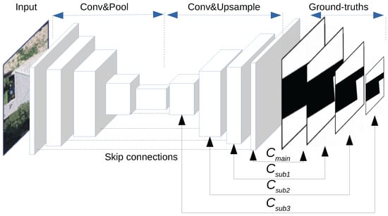 In the early stages, patch-based CNN approaches label a pixel by classifying the patch that centers around that pixel [23,24]. Even for a small patch of 32 × 32 pixels, to cover the whole area, the memory cost of these patch-based methods increases by 32 × 32 times. For larger areas or patch sizes, these approaches encounter dramatically increased memory cost and significantly reduced processing efficiency [25]. Fully convolutional networks (FCNs) improve this problem greatly by replacing the fully connected layer with upsampling operations [26]. Through multiple convolutional and upsampling operations, the FCN model allows efficient pixel-to-pixel classification of an image. However, the FCN model and other similar convolutional encoder–decoder models, such as SegNet [27] and DeconvNet [28], use only part of layers to generate the final output, leading to lower edge accuracy.