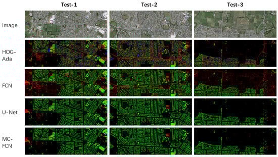 Segmentation results of HOG–Ada, FCN, U–Net and MC–FCN for the Test-1, Test-2 and Test-3 regions. The green, red, blue and black pixels of the maps represent the predictions of true positive, false positive, false negative and true negative, respectively.