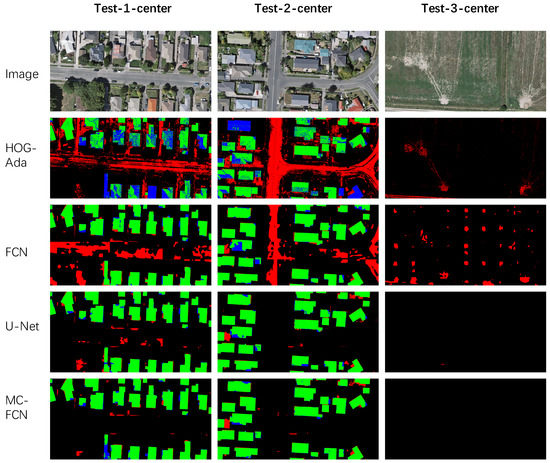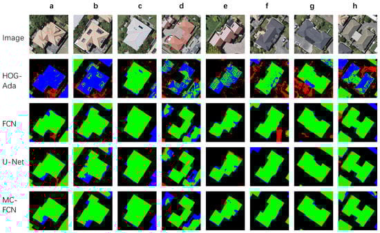 Segmentation results of randomly sampled buildings from the HOG–Ada, FCN, U–Net and MC–FCN methods. Images within columns (a–h) are sampled buildings from Test-1, Test-2 and Test-3 regions. The green, red and blue channels of results represent true positive, false positive and false negative predictions, respectively, of every pixel.