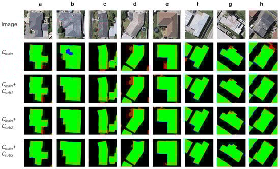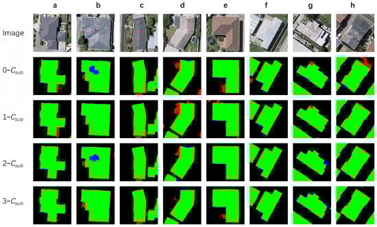 Representative results of building segmentation through MC–FCN models with variant numbers of subconstraints. The green, red and blue channels of results represent true positive, false positive and false negative predictions, respectively, of every pixel.