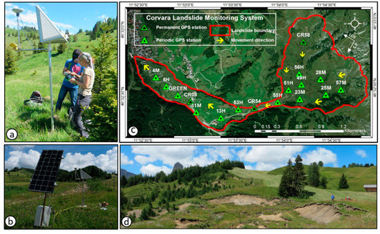 Corvara landslide monitoring system. (a) Periodic GPS measurements (monthly); (b) Permanent GPS station fed by solar panel; (c) Corvara landslide extent, its movement direction and CRs locations corresponding to the GPS network and (d) Active landslide depletion area (close to CR58).