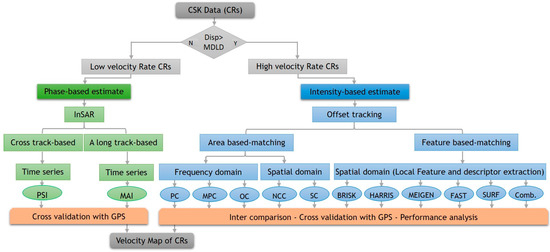 In this paper, the low velocity rate CRs corresponding to displacements in the MDLD range were processed using the PSI and MAI (only CR58) techniques over the time series. The high velocity rate CRs having displacements beyond the MDLD range were processed by offset tracking-based techniques. To investigate the performance of different offset tracking techniques several matching algorithms (i.e., area and feature-based matching methods) were applied to one CSK pair according to the first and last acquisition dates. This aims to estimate the CRs offsets between these two SAR images.