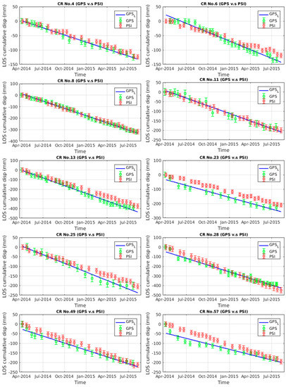 The PSI accumulative displacement is represented in Figure 6. In the plots, the GPS measurements are projected to the LOS for the PSI results and to the satellite azimuth for the MAI results using Equations (5) and (6), respectively. As GPS measurements were not acquired exactly at the same time (i.e., there were few days of difference) that the CSK acquisitions, the GPS measurements were approximated by a linear curve to make them comparable with the PSI results. The goodness of fit parameter (i.e., the R-square) for each fitted line is reported in Table 4. Figure 6 shows that the deviation of the PSI results from the GPS line varies for each CR. CR6, 23 and 57 present a variable agreement, CR4, 13, 28, 25 and 49 have a moderate agreement, and CR8 and 11 have a good agreement with the GPS measurements.