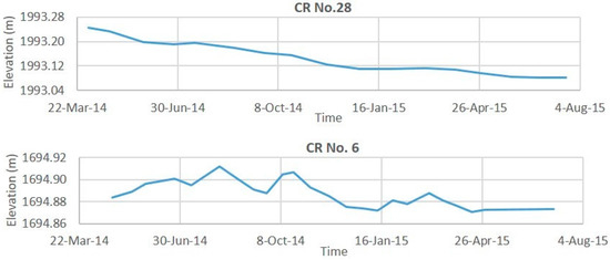When a SAR system response to a CR is reliable and stable (intensity and phase) in the time series, the CR orientation (i.e., azimuth and elevation angles) has been properly aligned toward the satellite. The Impulse Response Function (IRF) characteristic of a received signal is a significant indicator for data quality check. If a CR has been installed optimally, the footprint of a CR on a SAR image should show a cross-like shape and its IRF should be similar to an ideal IRF (i.e., a Sinc function, see Figure 2d). Several parameters can determine the quality of the SAR response to a CR including: (i) the Peak Side Lobe Ratio (PSLR) refers to the ratio between the peak elevation of the side lobe (Is) and the peak elevation of the main lobe (Im); and (ii) the Integrated Side Lobe Ratio (ISLR) indicates the ratio between the power in the main lobe and the total power in all the side lobes. In Figure 2d, the area below the 3 dB intensity points in the main lobe specifies Spatial Resolution (SR) of SAR data. Table 2 lists the PSLR in range and azimuth (i.e., RPLSR and APSLR) and the ISLR for each CR extracted. As an example, we show the IRF and intensity value of CR13 providing the highest backscattering signal (see Figure 2a–c). This quality check procedure helps in understanding whether the CRs have been tilted by the landslide movement or not. If so, the CR orientation changes could considerably influence InSAR and offset tracking results.