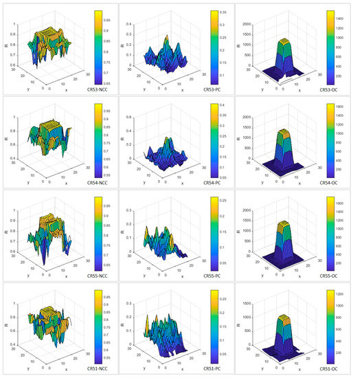 The comparison of the area and feature-based results in Table 10 show that the PC from the area-based and OC from feature-based categories provided better results than feature-based algorithms (see SPxy indexes). HARRIS and MEIGEN detectors generally provided more accurate results than BRISK and FAST, whereas FAST had the worst performance among the all corner-based detectors. In cases of CR54, CR51 and CR55, the HARRIS and EIGEN results were identical when combined with the SURF descriptor. This means that in case of high pixel value changes, the detector and descriptor combination does not affect on the results.