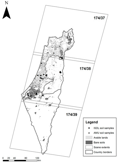 Location of soil samples obtained from the Israeli Soil Database Library (ISDL) and analyzed at Adam Mickiewicz University (AMU) based on bare soil areas extracted from the Landsat 8 images recorded on 9 September 2015, within arable land contours in Israel.