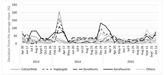 It was found that the acreages of the majority of the aforementioned great group units did not differ from their average values obtained from the 30 satellite observations by more than by 20% (Figure 2). Only the Calciorthids, Haplargids, Xerothents, and Xerofluvents, which occupied the smallest areas covering only a few pixels of the interpreted images, showed larger deviations in relation to their averaged areas, exceeding even 200%, 150%, 100% and 75%, respectively, in April 2014.