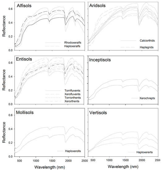 All of the above-mentioned soil units have also been described in terms of reflectance spectra measured in a laboratory, corresponding to the 28+3 soil samples (Figure 3). Most of the spectra of the bright soil orders, (Alfisols and Entisols) which have a color value higher than five, were developed from soil materials of different texture. In addition, the soil organic carbon (SOC) content in these soils was lower than 1.5%. These soils showed the highest reflectance, with a characteristic convexity in the visible spectral region (yellow and longer) (Table 1). Meanwhile, the Caliorthids great group, belonging to the Aridisols, had a clearly concave spectra in the visible and the near infrared range. Most of the dark soil orders, the Vertisols, Inceptisols, and Mollisols, with a color value of five or lower, predominantly contained more aggregates, due to their relatively high clay content (e.g., Verisols) or high SOC content (e.g., Mollisol), and showed only half the spectral reflectance of the brighter soils. The spectrum, presented additionally in Figure 3, also shows the effect of averaging all of the 31 analyzed spectra according to the proportion of the area of these 11 soil great group units, which were the basis for calculating the αθs distribution of soils representing all the bare soils in the arable land in Israel for any day of the year.