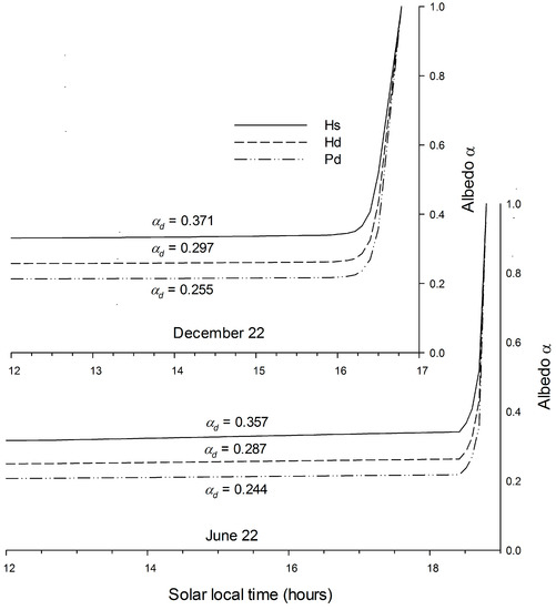 Half-diurnal albedo distributions of the average bare soils within arable lands in Israel, generated for the shortest (22 December) and the longest (22 June) day of the year, respectively, in relation to the local solar time.