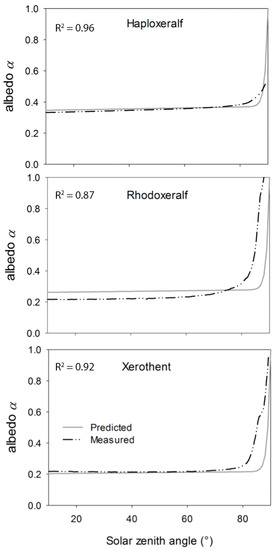 Figure 4 presents examples of the half-diurnal (αd) distributions for these averaged soils, with roughness corresponding to the use of a Pd, an Hd, and an Hs, generated for chosen dates as a function of the solar local time. The averaged half-diurnal values of these soils, calculated for the shortest day of the year (22 December), were, respectively, 3.8%, 4.0%, and 4.8% higher than for the longest day (22 June). We were able to evaluate the accuracy of the predicted distributions using only the spectra of the Haploxeralfs, Rhodoxelalfs, and Xerothents, because only these three units had distributions also collected directly in the field. Figure 5 shows the measured and predicted distributions of the three additional units. R2, calculated individually for these units up to 75° of θs at 1° increments, reached values higher than 0.92 for the Haploxeralfs and Xerothents, and only 0.87 for the Rhodoxeralf. It was also found that the aggregated correctness of prediction for these three soils, expressed by the RMSE, was 0.025, and additionally, the plot of residuals of the prediction of α45 was generated to confirm that the residuals had a normal distribution (Figure 6). The residuals showed if the predicted value was higher or lower than the measured value, and in this case, they were roughly distributed symmetrically above and below the value of 0, meaning that model was not biased. The half-diurnal albedo of the soils formed by a Pd or an Hd was lower than that of the soils formed by an Hs of, respectively, about 45% and 25% at the beginning of the astronomical summer, compared to about 40% and 20% at the beginning of the astronomical winter (Figure 7a).