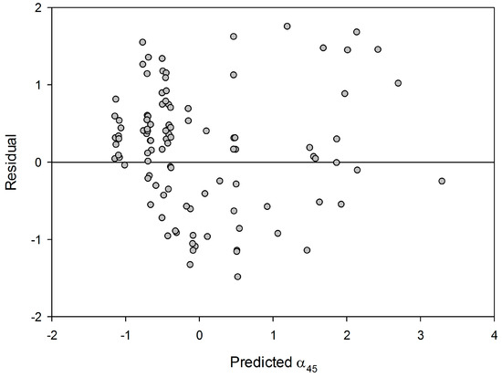 Plot of residuals showing normalized residuals versus normalized predicted values of α45.