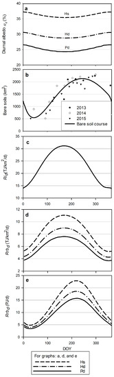 Annual variations in: (a) average diurnal albedo (αd) of the average bare soils within arable lands in Israel, formed by a plough (Pd), a disk harrow (Hd), and a smoothing harrow (Hs); (b) areas of bare soils within arable lands in Israel; (c) amount of shortwave radiation (Rid) reaching the soils in clear-sky conditions; (d) amount of shortwave radiation reflected from one square kilometer of the soils (Rrbd); (e) amount of Rrbd reflected from all bare soils within arable lands in Israel. DOY—day of year.