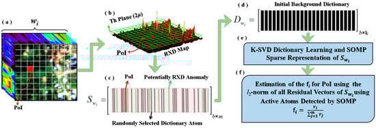 After the Dwi was learned via K-SVD, finding a common subspace for all Swi signals is performed through the SOMP algorithm (part e). In this algorithm, the sparse coding of a set of signals is simultaneously carried out. This means that all of the Swi signals will be simultaneously estimated through the same subspace spanned by the atoms in the learned dictionary with the minimum dimension. Furthermore, the minimization of the l2-norm of estimated residuals should be satisfied. The aim of this process is choosing the background descriptive atoms to reconstruct the Swi signals. As discussed before, it is expected that, during this process, the background signals are estimated to be more precise than the rare and anomalous signals. When considering this expectation, after the estimation of the Swi residual vectors using SOMP, their l2-norm for all wi signals would be calculated as rj, j = 1, 2, …, m. To continue, the index fi for the PoI will be estimated by normalizing the ri corresponding the location of PoI in wi through the Equation (3):
