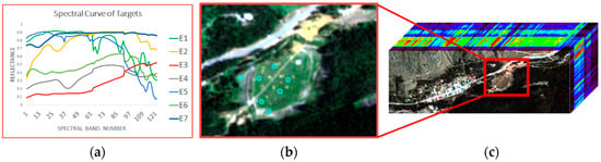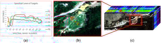 Viareggio real dataset: (a) the spectral curve of targets; (b) The location of targets in selected subset; and, (c) the original data.