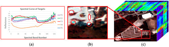 The third real data has been acquired from a region in Viareggio city in Italy collected by the SIM.GA airborne sensor [46]. Although this original dataset has 512 spectral bands, ranging from 388–994 nm, after removal of the low Signal to Noise Ratio (SNR) bands, by applying a spectral resampling process with a 4 nm interval, it has been converted to a 100 × 100 × 123 hypercube. In the area of interest on this image, five spectral targets with extents of more than a few pixels were chosen to apply anomaly detection algorithms. Figure 5 shows the original data, the area of interest, and the spectral curve of targets.