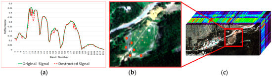 As the second strategy of synthetic data generation, spectral destruction of original signals in the real RIT dataset was performed. In this strategy, a variation between ±5 to ±20% with respect to the original signals was applied to a randomly selected number of spectral bands (ranging from 5–10% of the total image bands) for six candidate pixels and a total of 12 potential anomaly pixels were constructed. The location of candidate pixels in this strategy were also locally chosen similar to the first strategy in the relatively homogeneous regions. The position of the destructed signals, a sample of the destructed spectral curve, and its related original data are displayed in Figure 7.