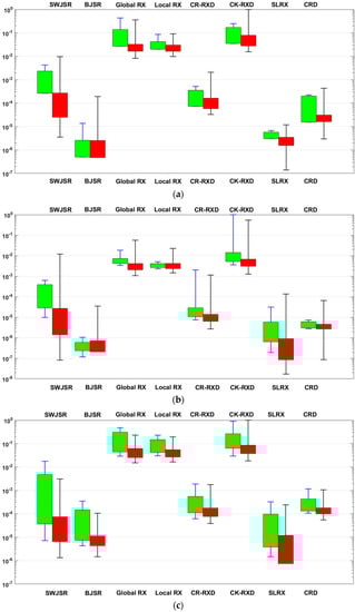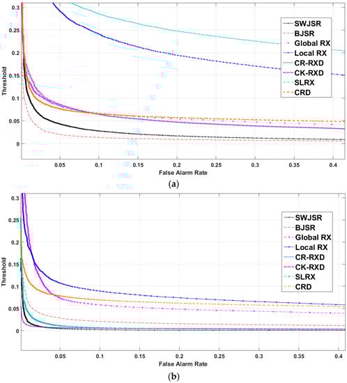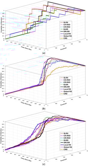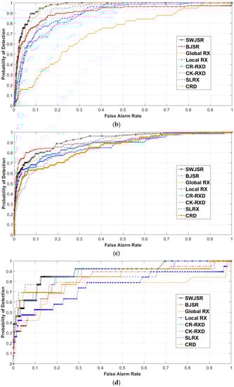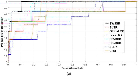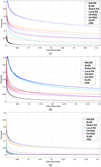 To compare the results obtained from the proposed algorithm, seven other anomaly detection algorithms were also implemented. The traditional Global and Local RX algorithms [12], Causal R-RX, and K-RX [22], as well as the recently-developed CRD [23] and BJSR [33] algorithms in the field of anomaly detection were chosen for this evaluations. Except the Global RX which has not any setting parameters, other six algorithms have several setting parameters. Generally, default setting parameters proposed by the developers were used in our comparisons. Window size is the only setting parameter in Local RX method. Generally, the best result obtained from windows of 11 × 11, 13 × 13 and 15 × 15 pixels were used in the comparisons. In Causal R-RX and K-RX, the window width of sliding array is the main setting parameter which set to CW = 900, according the best result obtained in [22]. The CRD setting are inner and outer windows as well as the regularization parameters. Here, a 7 × 7 inner and a 15 × 15 outer window size as well as 10−6 were set as the regularization parameter [23]. In continue, the BJSR setting parameters are background and guard window size, search window and level of sparsity. Window sizes (background and guard) were selected based on the optimum setting reported in [33]. So, a 17 × 17 background window, 5 × 5 guard window, and 19 × 19 search window were the spatial setting and the sparsity level was set to 3 in SOMP method [33]. However, among the detection algorithms used in this paper, the Local RX algorithm (LRX) was easily adapted to the proposed sliding window. Thus, a new version of Local RX called the Sliding-window Local RX anomaly detector (SLRX) is also used in the evaluations. In this version, the generation of FPOI for each PoI is based on the Mahalanobis distance calculated by the Local RX of samples in the wi windows. Again, and similar to the method of SWJSR, the variance of FPoI has been used as the measure of this detector for each PoI.